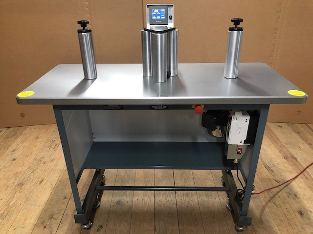 Model 400 is a large capacity, heavy duty rewind table designed for the converter or label manufacturer handling rolls up to 24" diameter, 10" web width and weighing up to 95 lbs. max. The Model 400 uses a 2 HP AC motor and speed control. It is provided with heavier bearings and drive shaft as well as heavier unwind and rewind shafts. Core holders and idler spindles are designed for for 10" web. In addition to its heavier design it has all the features of the Model 300. The Model 400 comes complete with two 3" wedge lock core holders and manual. NOTE: Requires 240 VAC, 12 AMP.