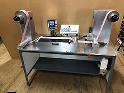 This horizontal machine has an edge guide system and will recover telescoped bad rolls or can be used with foil. The two stage counter will slowdown and stop to your desired length or label amount. A slitting attachment is also included with three knife holders. The rewind shaft will wind in either CW or CCW direction, and the machine is supplied with two 3" mechanical leaf core holders and a complete operations manual.